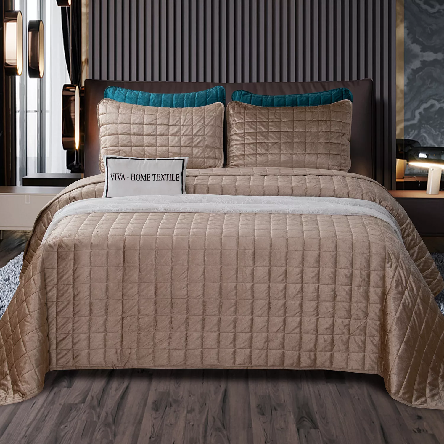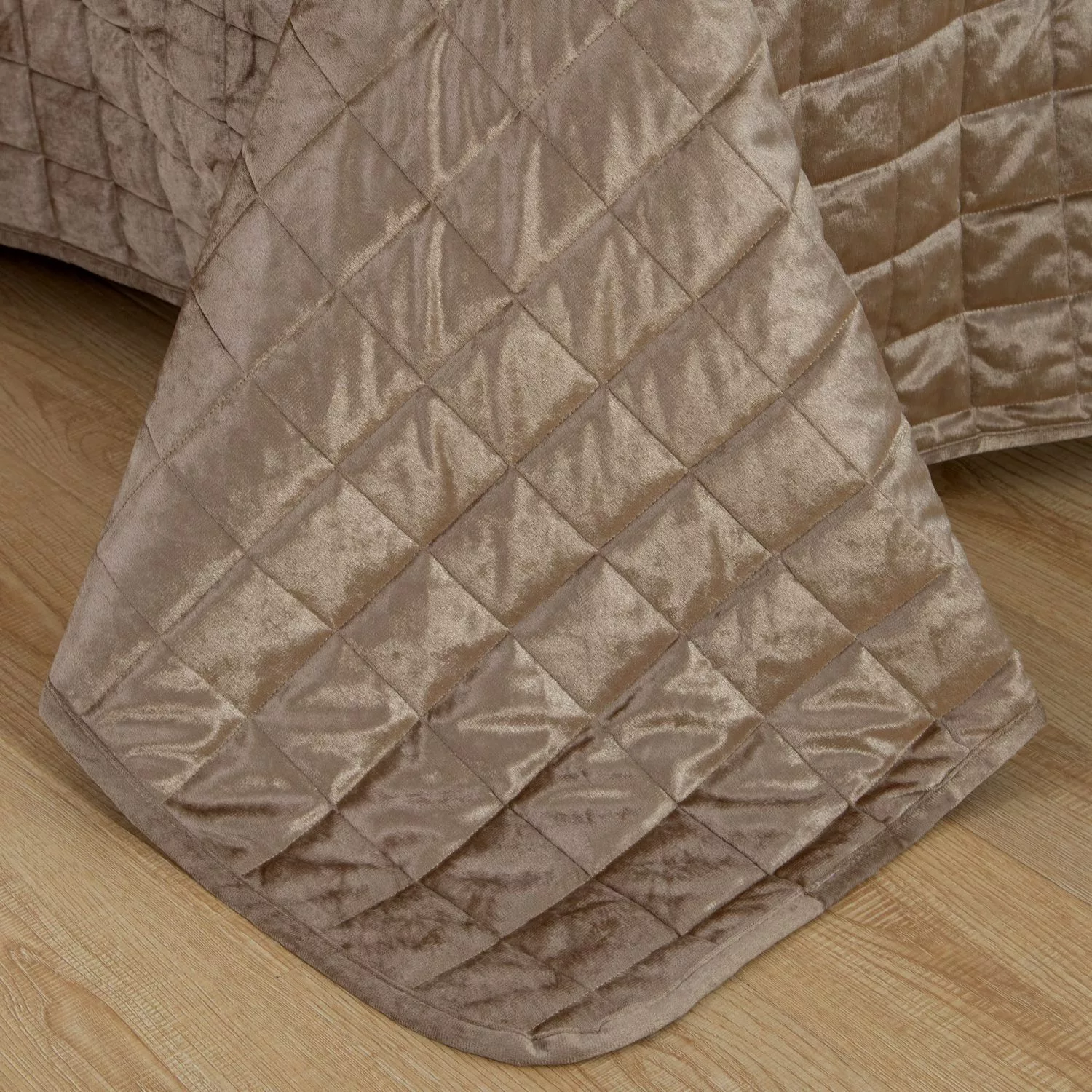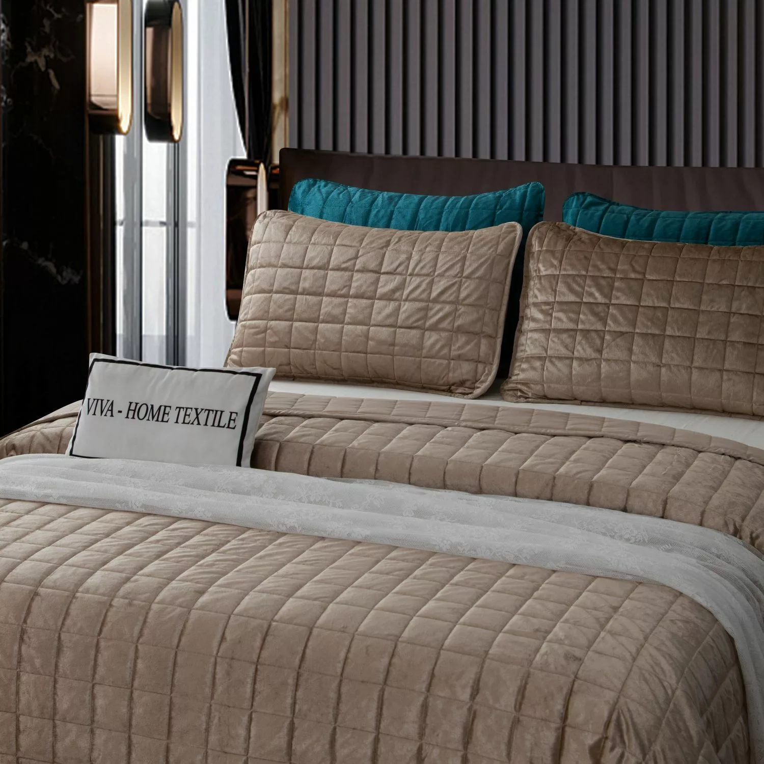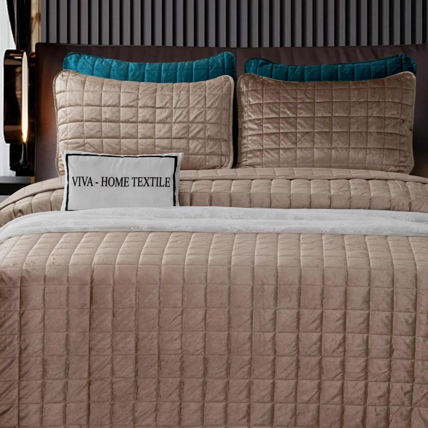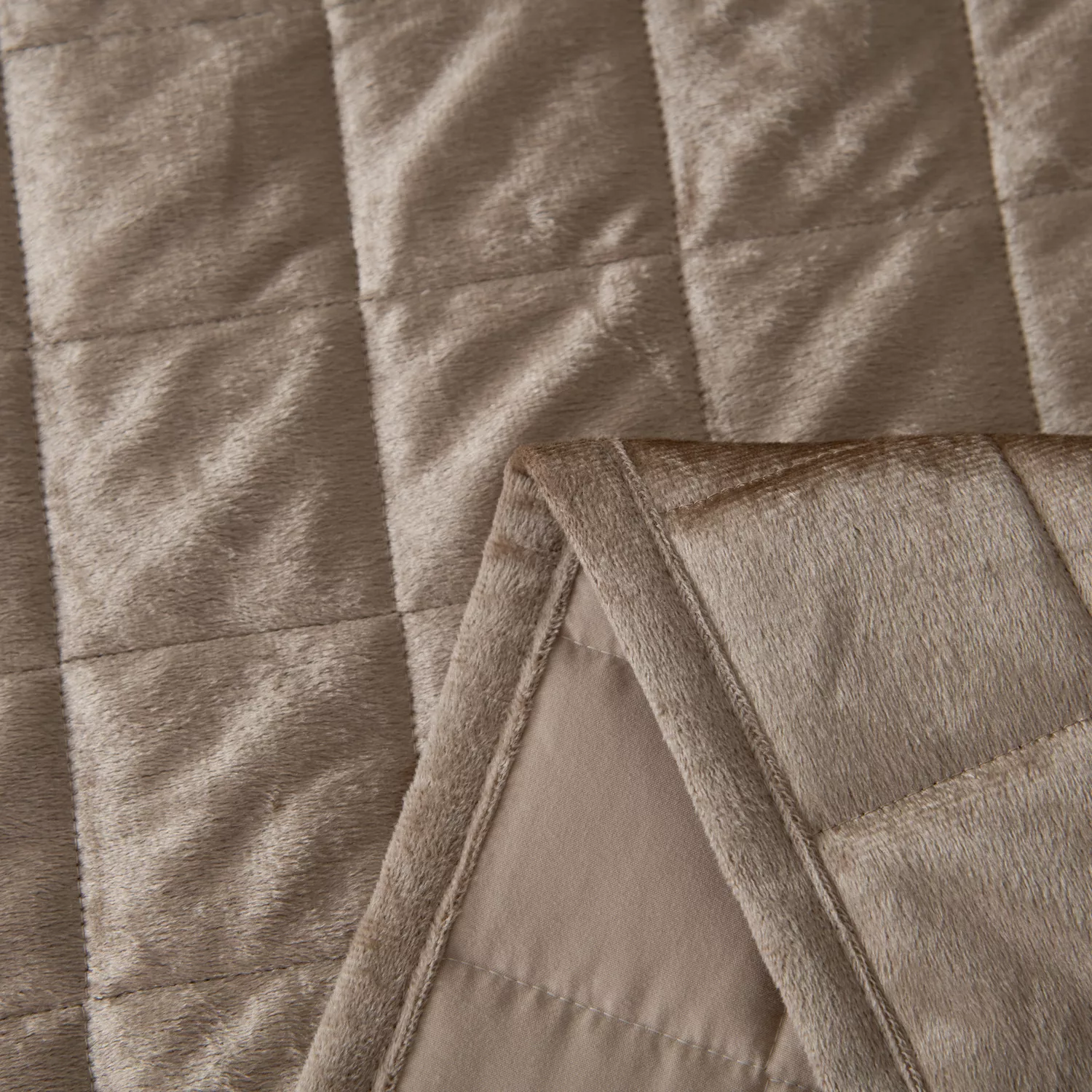 Велюровое покрывало в клетку и две наволочки (Бежевый)